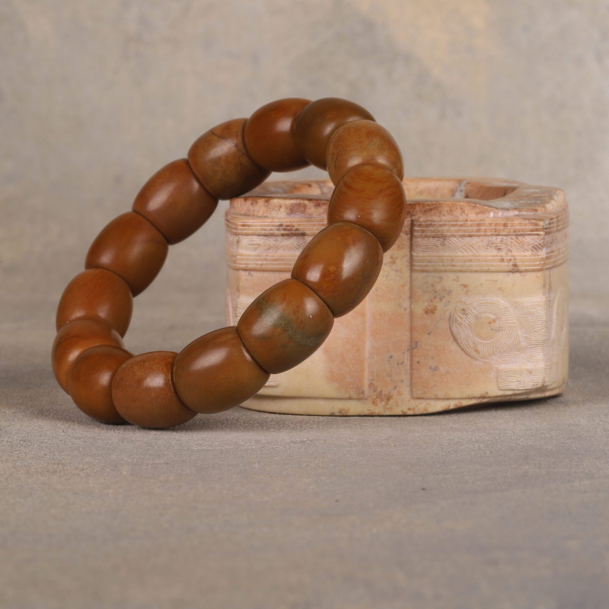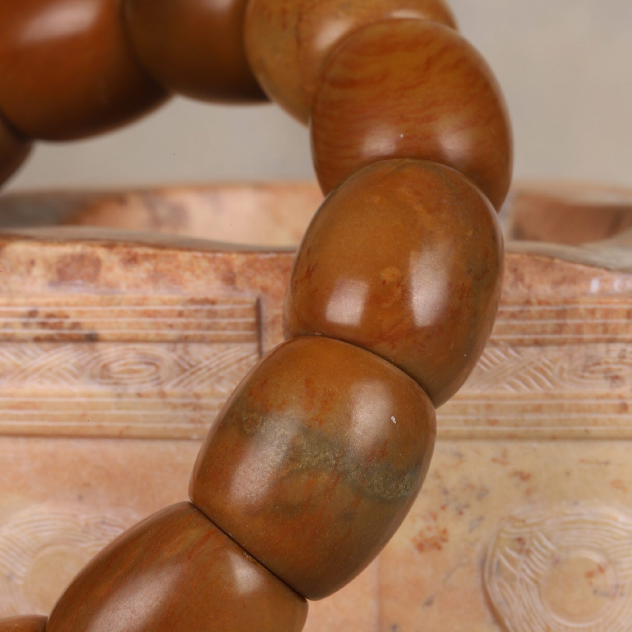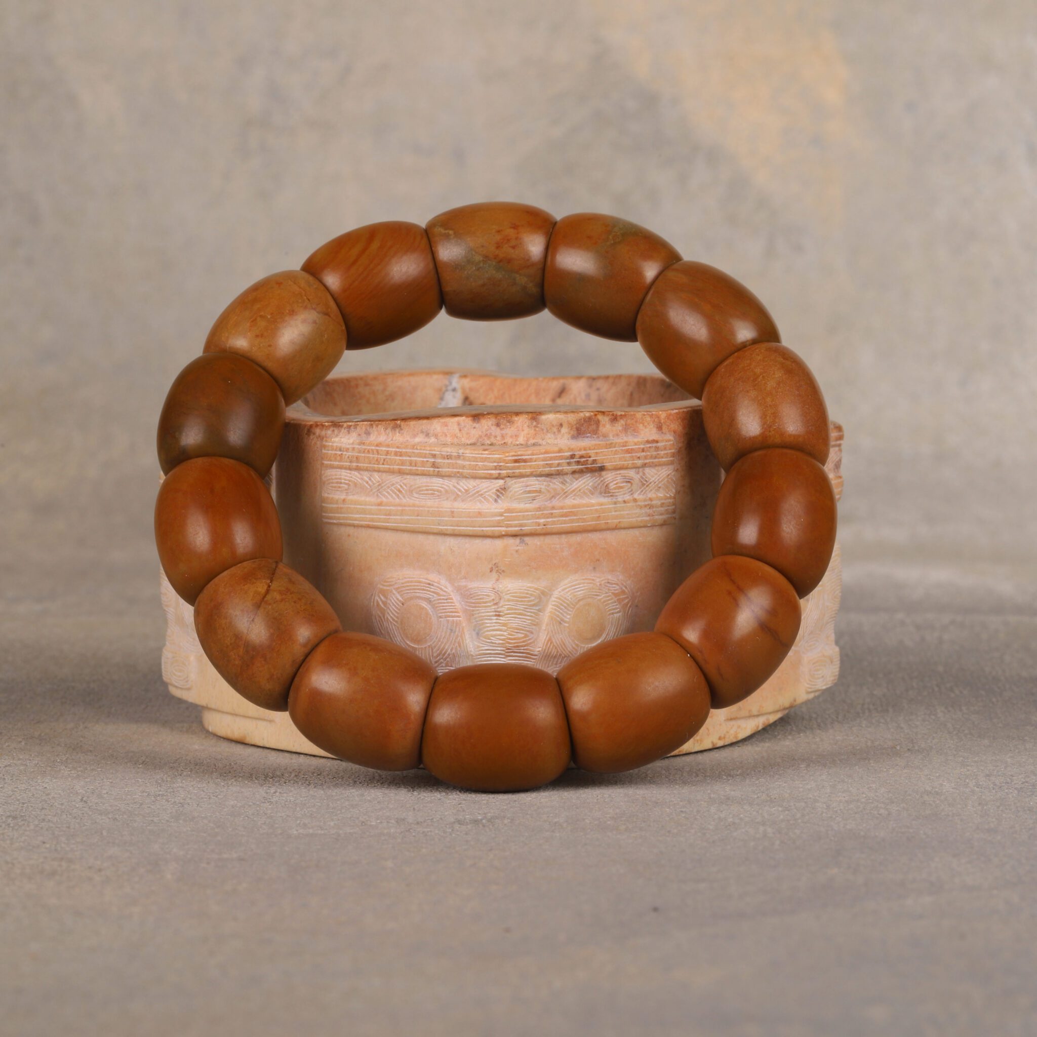 Браслет выполнен из нефрита из провинции Ляо нин на северо-востоке Китая, горный район Ань Шань. Такой нефрит называется Хэ Мо Юй — Нефрит, отполированный рекой. Геологически это собственно нефрит, тремолитового ряда. Твёрдость по шкале Мооса 6,0-6,5. Характерной особенностью нефрита Хэ Мо является наличие достаточно толстой и красивой «кожицы», которая обыгрывается резчиком, создавая красивую цветовую палитру с камнем. «Кожица» такого цвета встречается только у нефрита Хэ Мо. Часто предметы делаются практически из одной «кожицы». Такое сырьё называется Йоу Пи Ляо-Маслянистая кожа. Многие коллекционеры ищут именно такое сочетание «кожи» и «мякоти», где, вроде кожа, а вроде мякоть. Размер бусины 17*15 мм. Внутренний диаметр браслета 55 мм