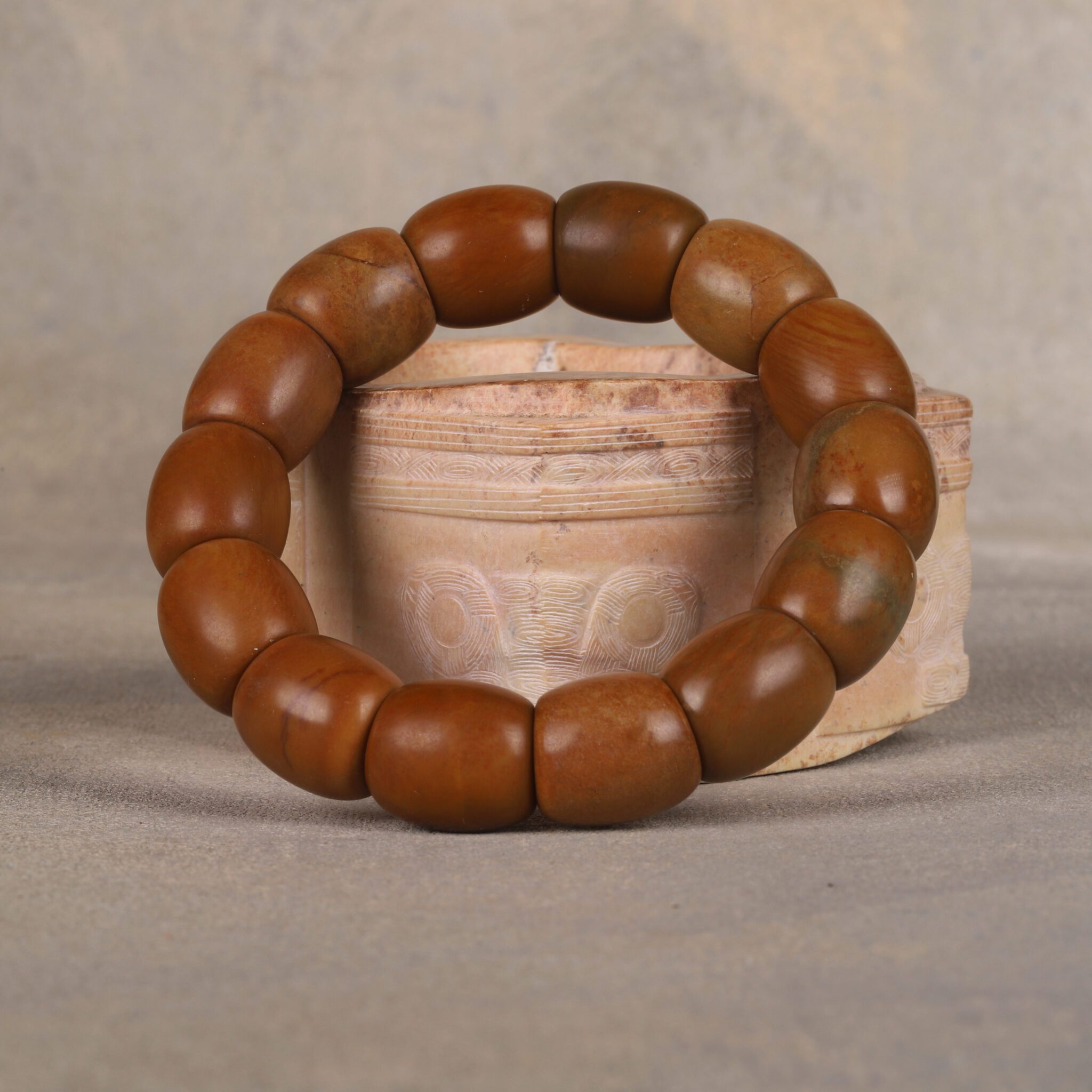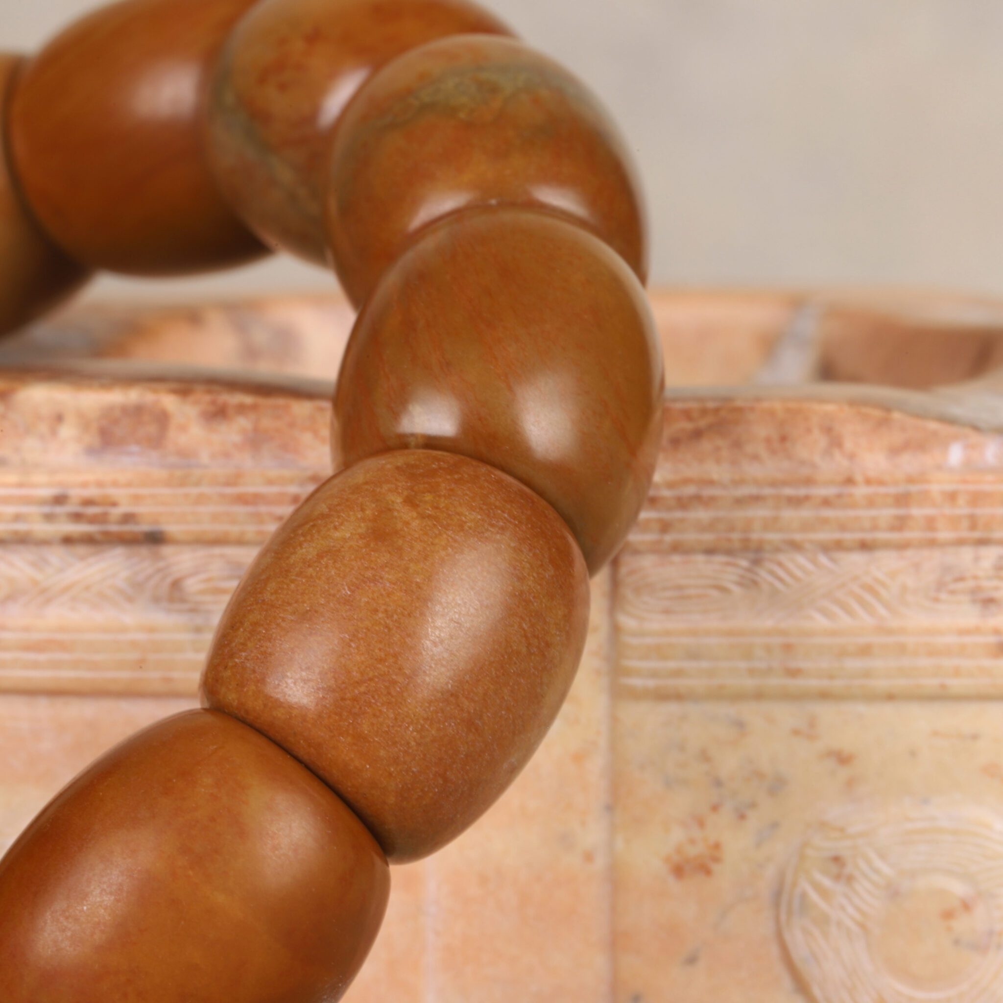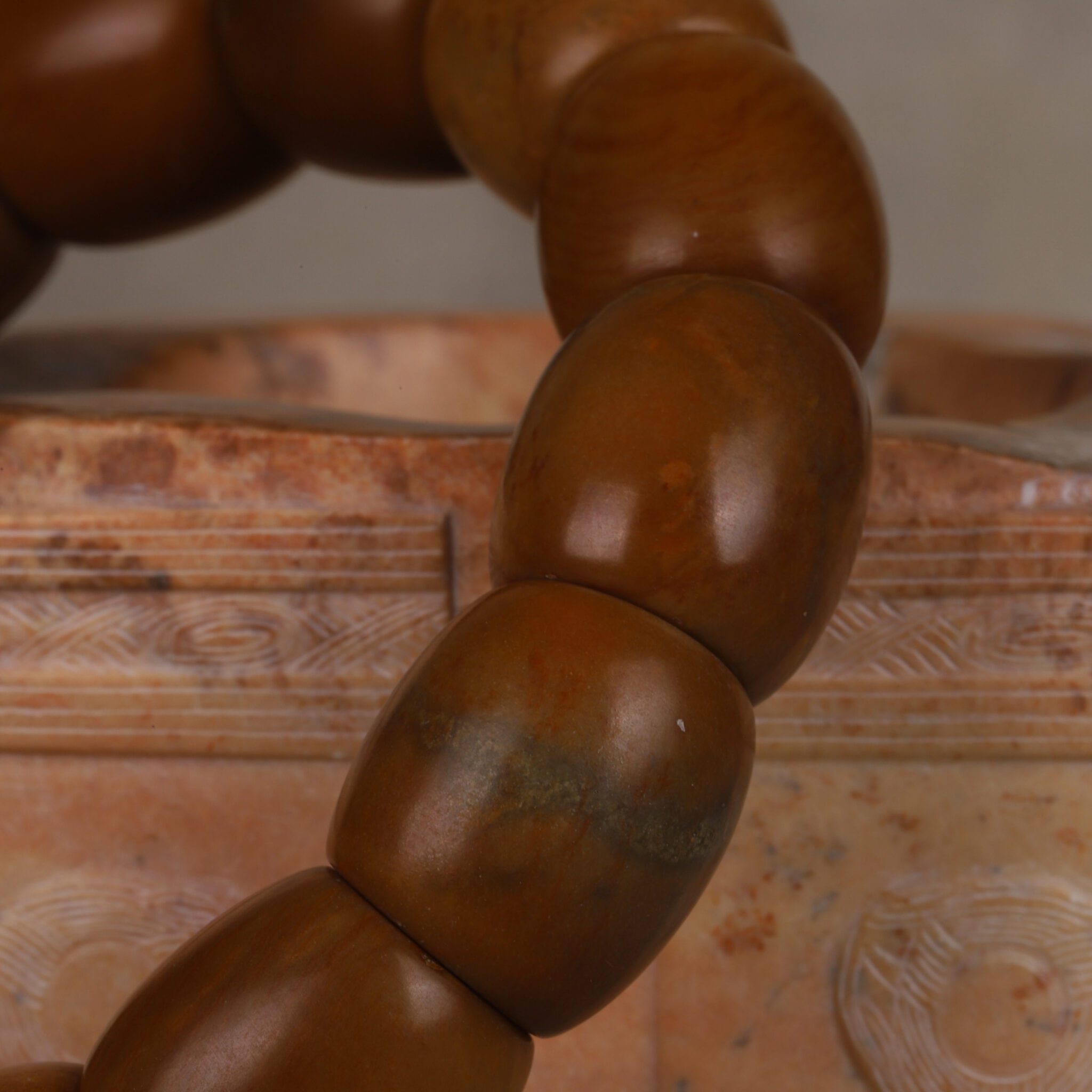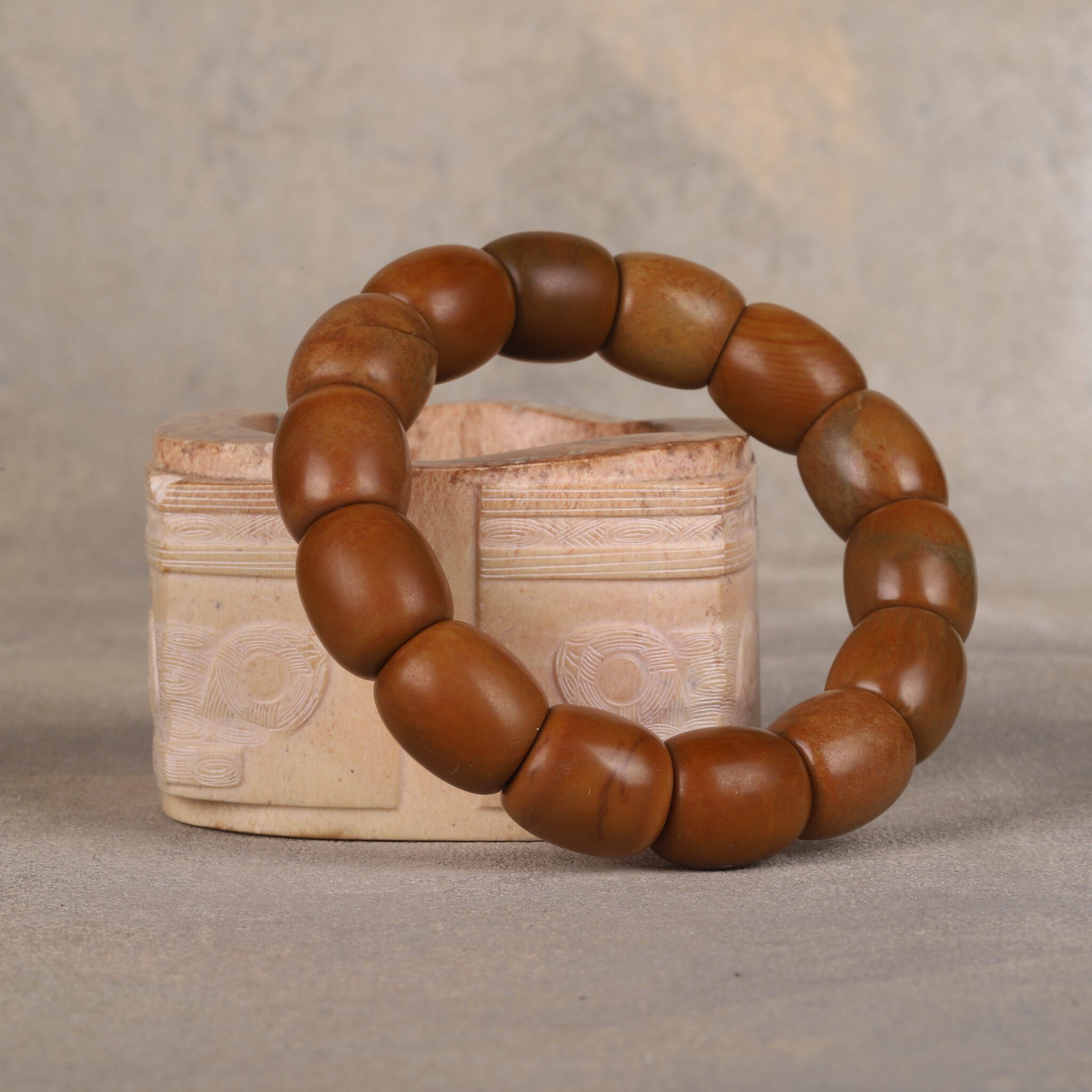 Браслет выполнен из нефрита из провинции Ляо нин на северо-востоке Китая, горный район Ань Шань. Такой нефрит называется Хэ Мо Юй — Нефрит, отполированный рекой. Геологически это собственно нефрит, тремолитового ряда. Твёрдость по шкале Мооса 6,0-6,5. Характерной особенностью нефрита Хэ Мо является наличие достаточно толстой и красивой «кожицы», которая обыгрывается резчиком, создавая красивую цветовую палитру с камнем. «Кожица» такого цвета встречается только у нефрита Хэ Мо. Часто предметы делаются практически из одной «кожицы». Такое сырьё называется Йоу Пи Ляо-Маслянистая кожа. Многие коллекционеры ищут именно такое сочетание «кожи» и «мякоти», где, вроде кожа, а вроде мякоть. Размер бусины 17*15 мм. Внутренний диаметр браслета 55 мм