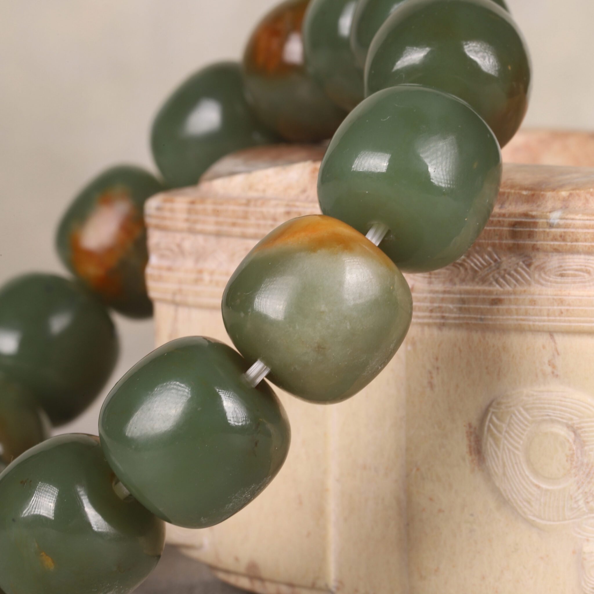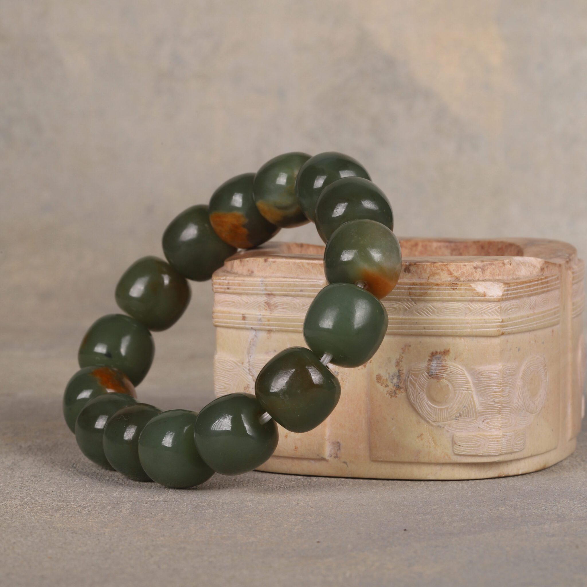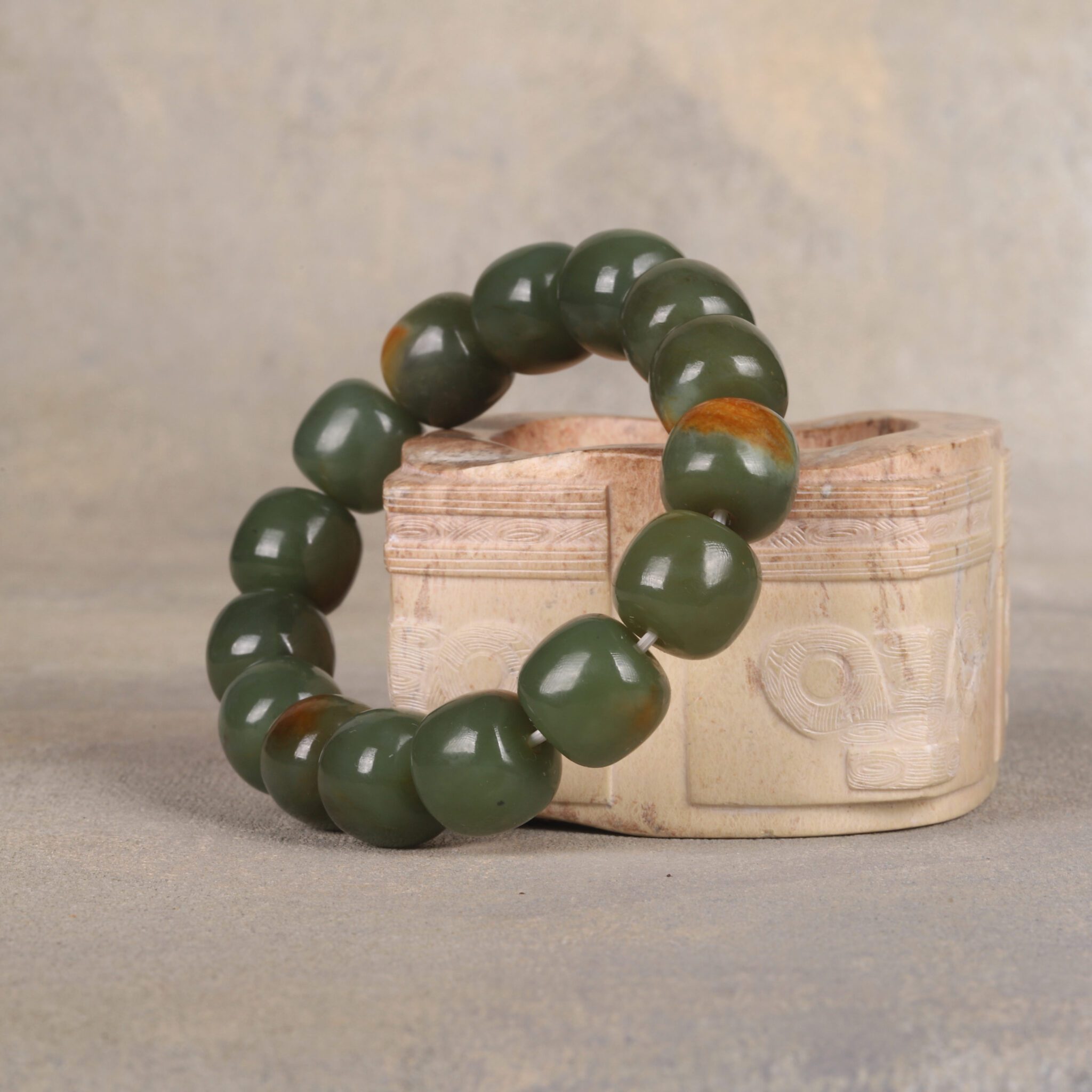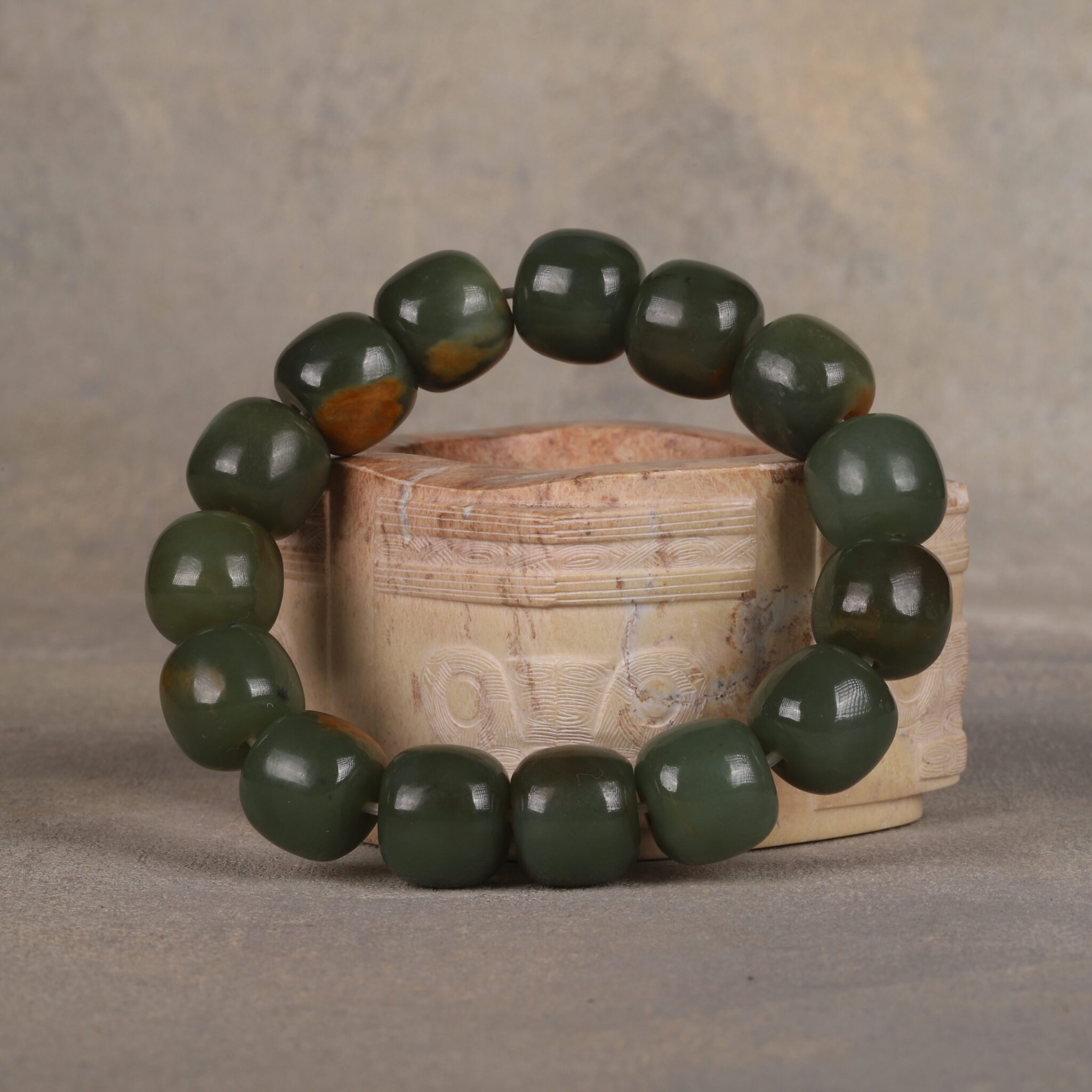 Браслет из нефрита из провинции Ляо нин на северо-востоке Китая, горный район Ань Шань. Такой нефрит называется Хэ Мо Юй — Нефрит, отполированный рекой. Хэ Мо Юй зелёного цвета добывается в районе Си Му и потому называется Си Му Люй. Геологически это собственно нефрит, тремолитового ряда. Характерной особенностью нефрита Хэ Мо является наличие красивой «кожицы», которая обыгрывается резчиком, создавая красивую цветовую палитру с камнем. «Кожица» такого цвета встречается только у нефрита Хэ Мо. Диаметр бусин 16*14 мм Внутренний диаметр браслета 60 мм