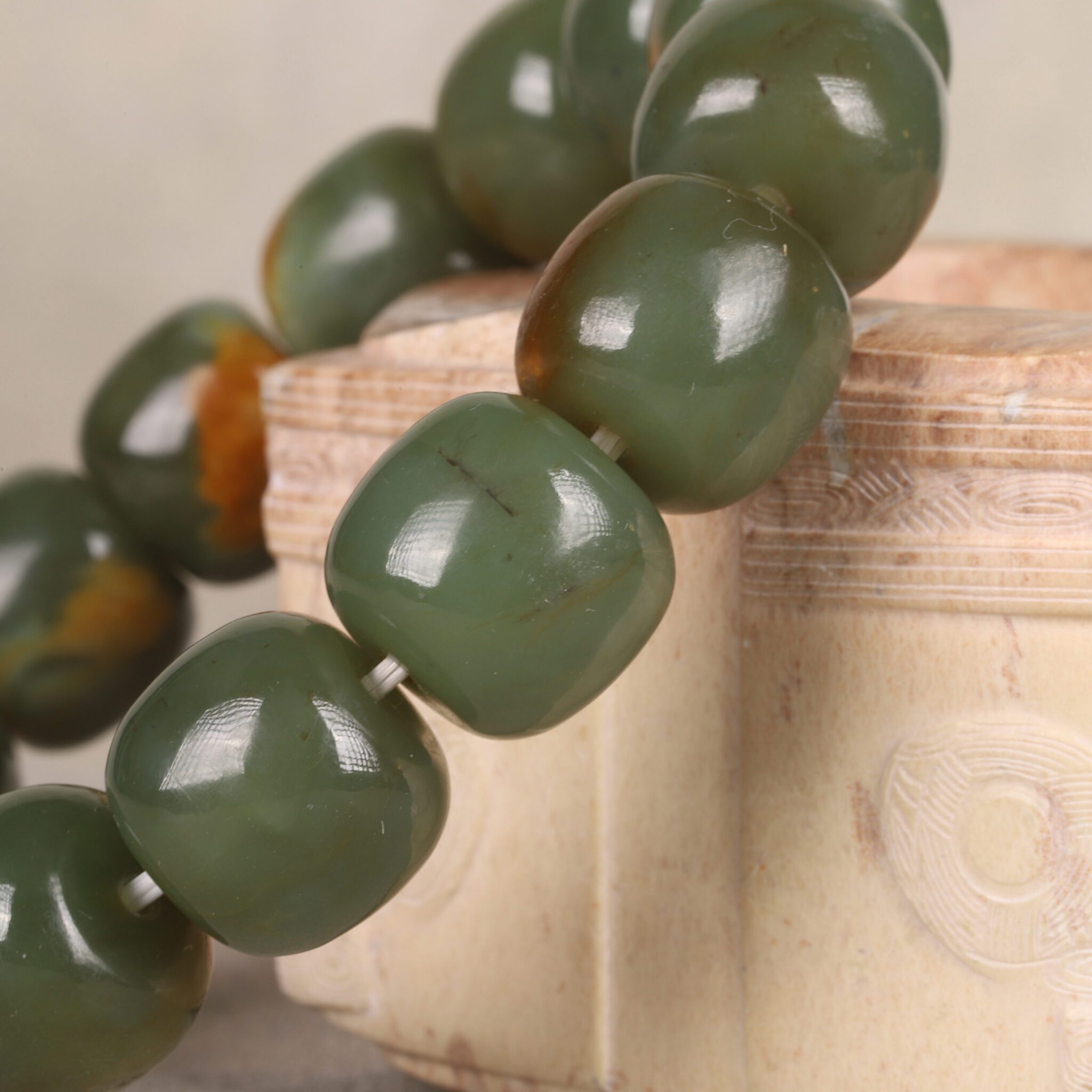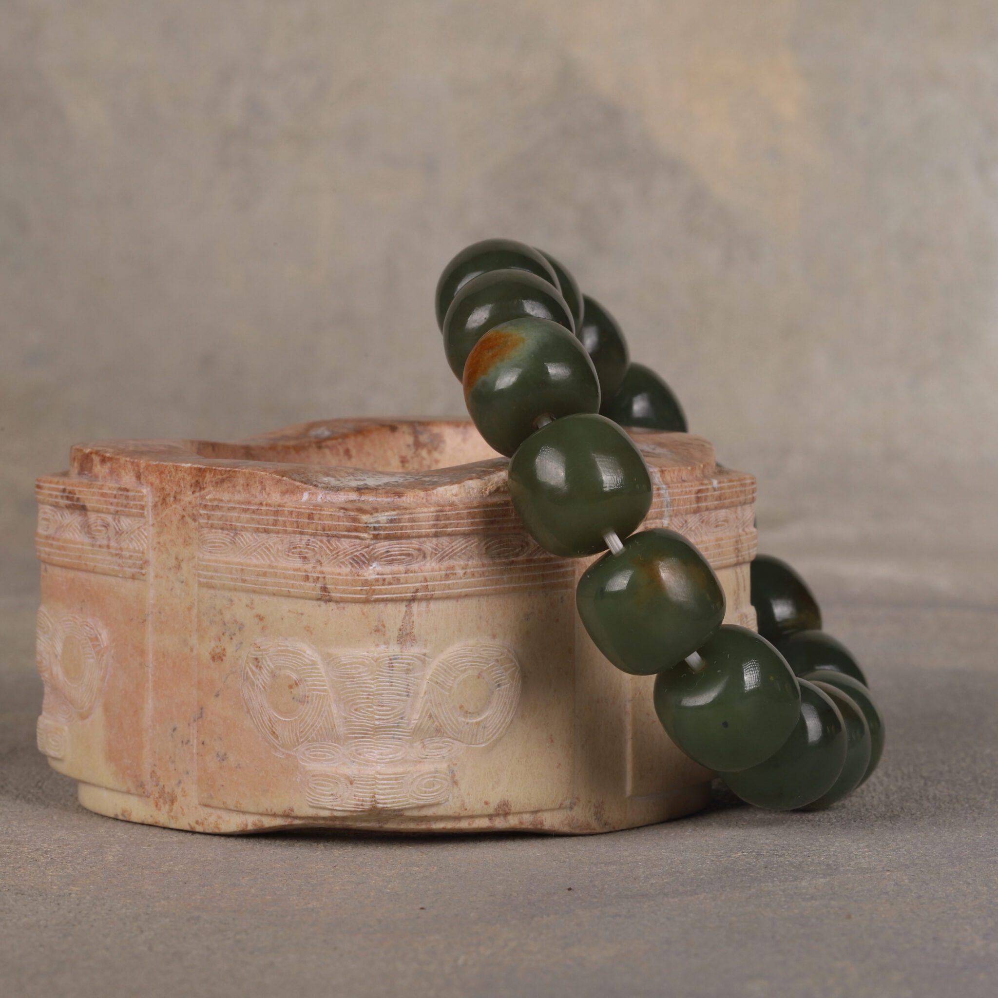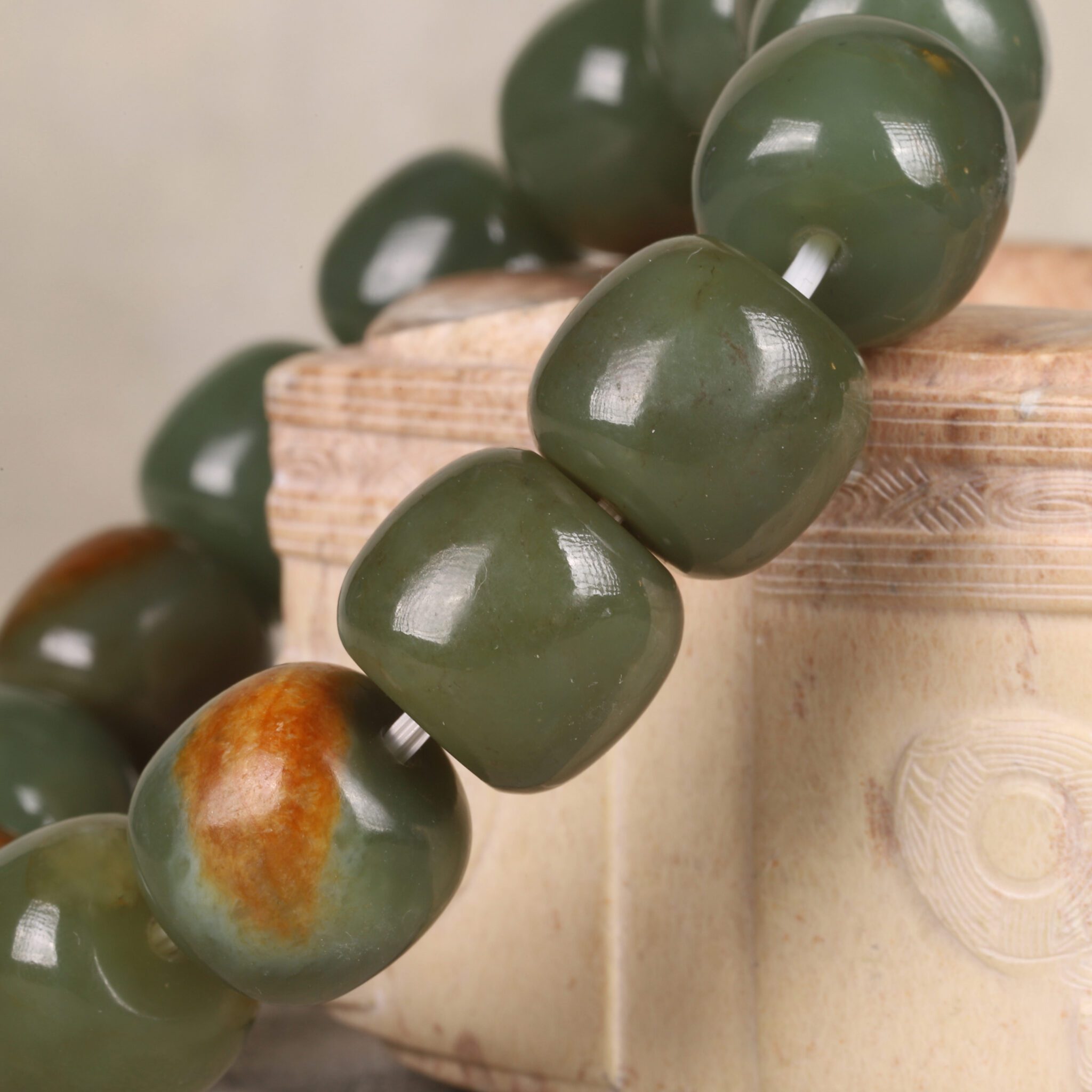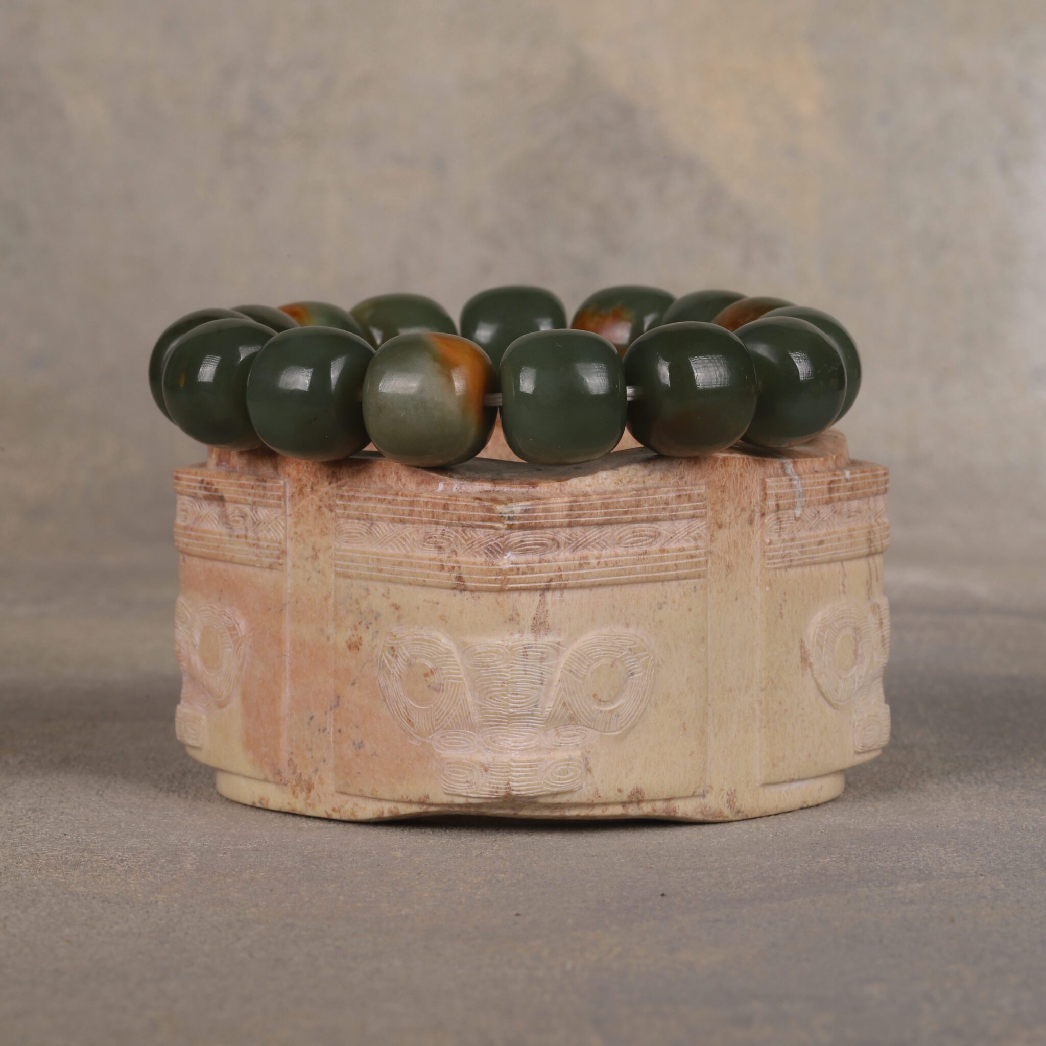 Браслет из нефрита из провинции Ляо нин на северо-востоке Китая, горный район Ань Шань. Такой нефрит называется Хэ Мо Юй — Нефрит, отполированный рекой. Хэ Мо Юй зелёного цвета добывается в районе Си Му и потому называется Си Му Люй. Геологически это собственно нефрит, тремолитового ряда. Характерной особенностью нефрита Хэ Мо является наличие красивой «кожицы», которая обыгрывается резчиком, создавая красивую цветовую палитру с камнем. «Кожица» такого цвета встречается только у нефрита Хэ Мо. Диаметр бусин 16*14 мм Внутренний диаметр браслета 60 мм